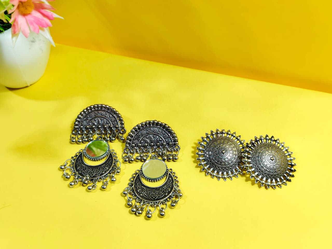 ⨠Enhance your elegance with these stunning oxidized silver jhumka earrings featuring intricately designed circular studs đ . Lightweight yet elegant, they perfectly blend traditional craftsmanship  with modern charm đ¸. Ideal for festive occasions đ, weddings đ, or even daily wear đŋ, these timeless jhumkas are a must-have for every jewelry loverâs collection đ.